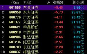 日前,券商股午前再度上行,东吴证券一度封板截至午间收盘,东吴证券涨9%,东方证券涨5%,广发证券涨4%,兴业证券涨超3%
